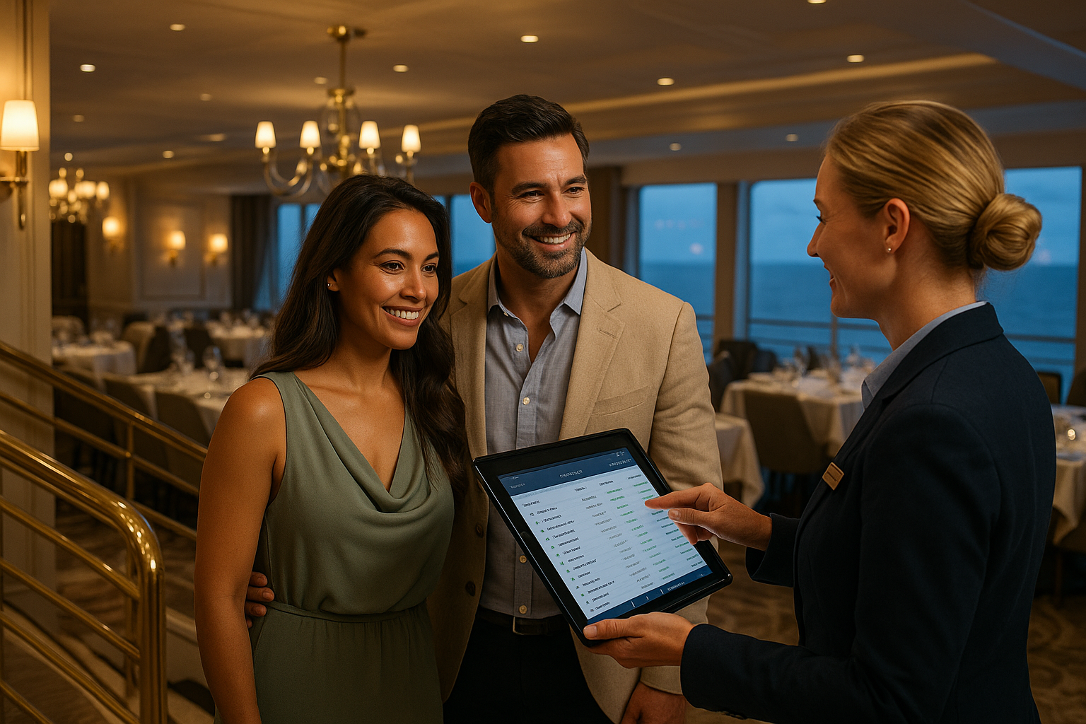 Dining room operations, specialty venues, and meal counts. Conflict alerts prevent overlaps with excursions or spa bookings and respect guest preferences.